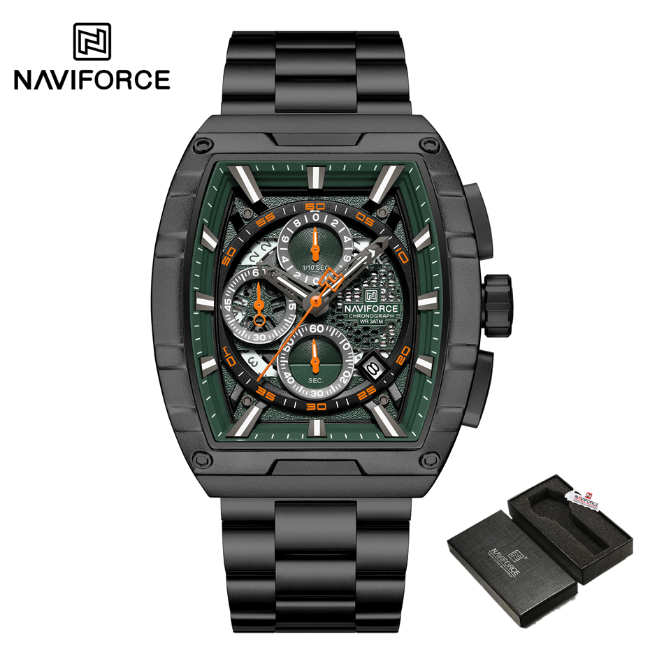 NAVIFORCE zegarek kwarcowy dla mężczyzn moda wodoodporny świecący chronograf zegarek Auto data pasek ze stali nierdzewnej zegar prezent: green
